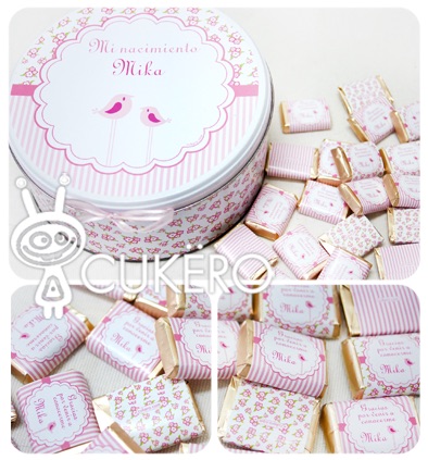 Lata con chocolates y tarjetitas para completar con los datos del bebé.